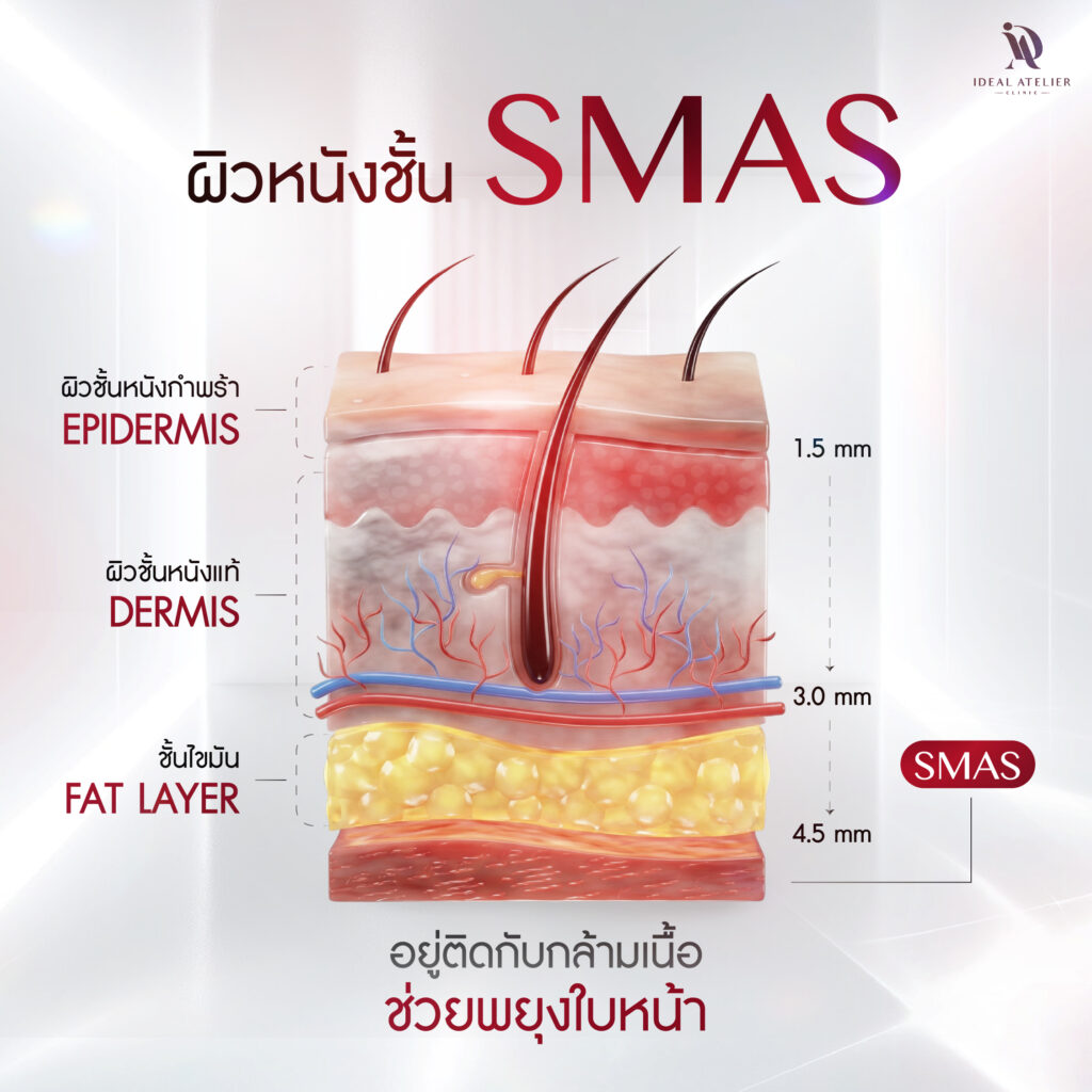 ชั้น SMAS (Superficial Musculo-Aponeurotic System) เป็นชั้นสำคัญในการดึงหน้า เพราะเกี่ยวข้องกับการพยุงโครงสร้างของใบหน้าอยู่ติดกับกล้ามเนื้อ